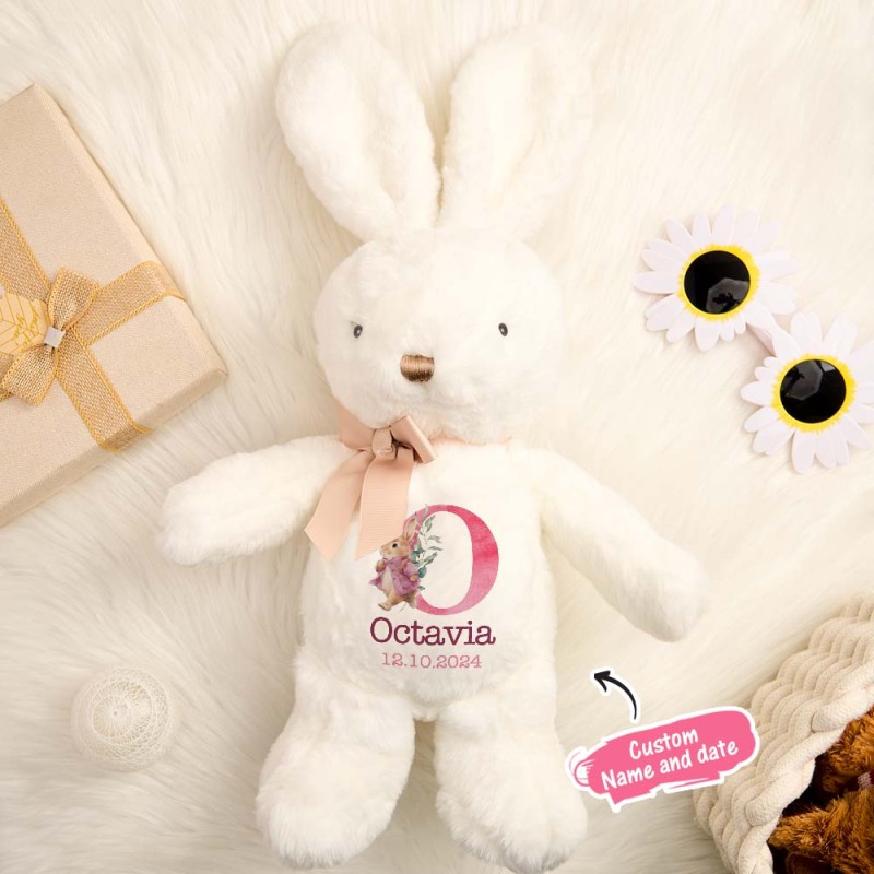 This personalized bunny rabbit plush stuffed toy is the perfect gift for a baby shower! Made with high-quality materials, this toy is soft, cuddly, and sure to be a favorite for the little one. You can personalize it with the baby's name, making it a special and memorable keepsake. A thoughtful and adorable gift for the new addition to the family.