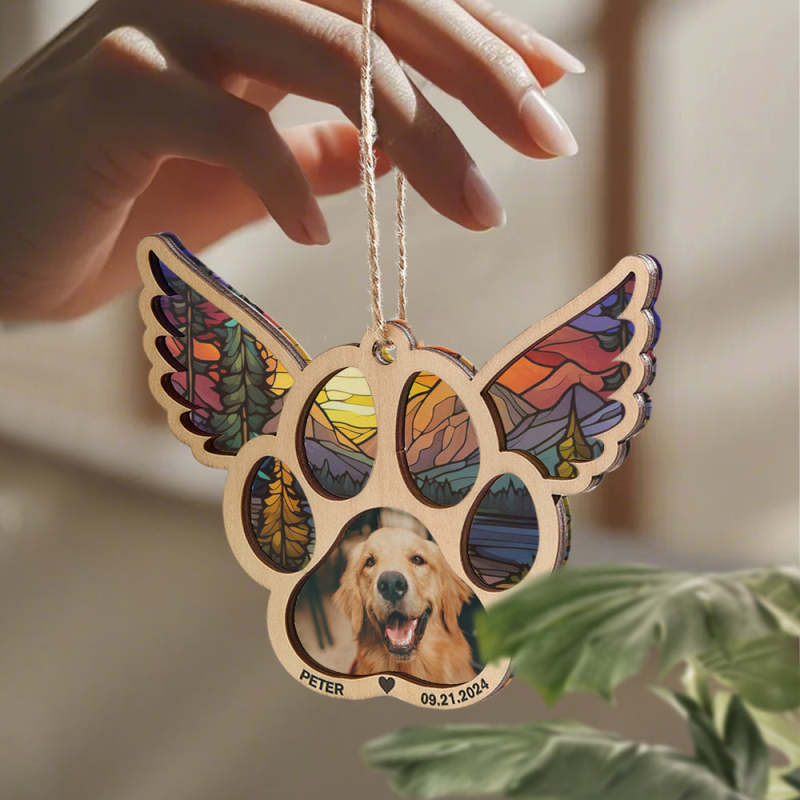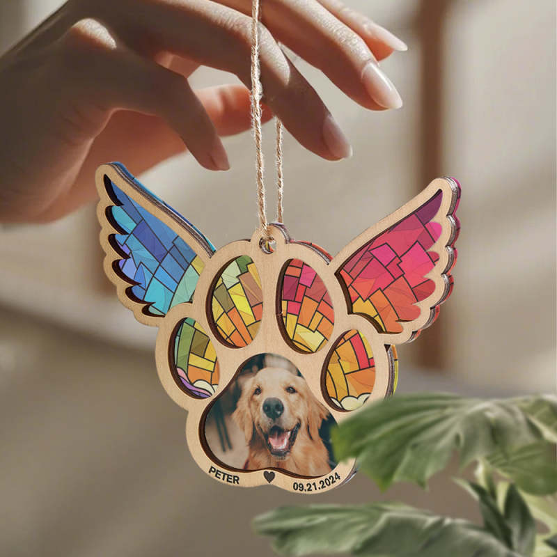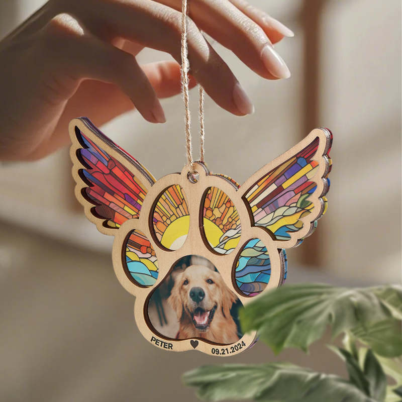 Celebrate the memory of your furry friend with our personalized pet suncatcher ornament. This special ornament features your pet's name and photo, making it a beautiful memorial gift for pet lovers. Each one is custom-made and captures the unique bond between you and your beloved pet.